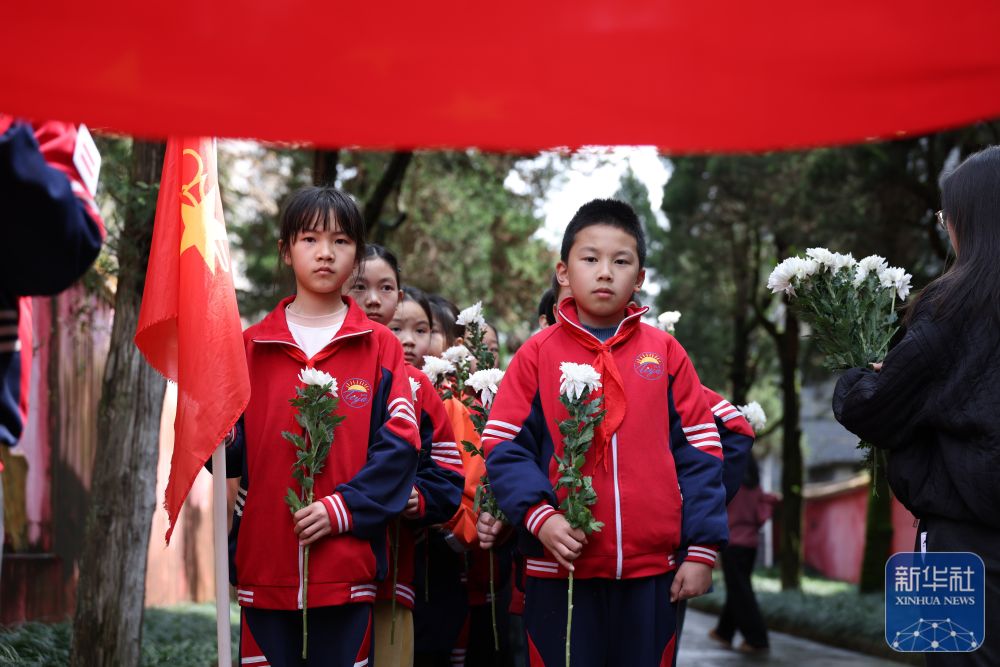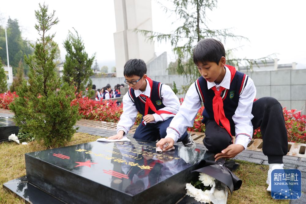 ↑ 4月2日,重庆市黔江区烈士陵园,少先队员在擦拭烈士墓碑。新华社发(杨敏摄)