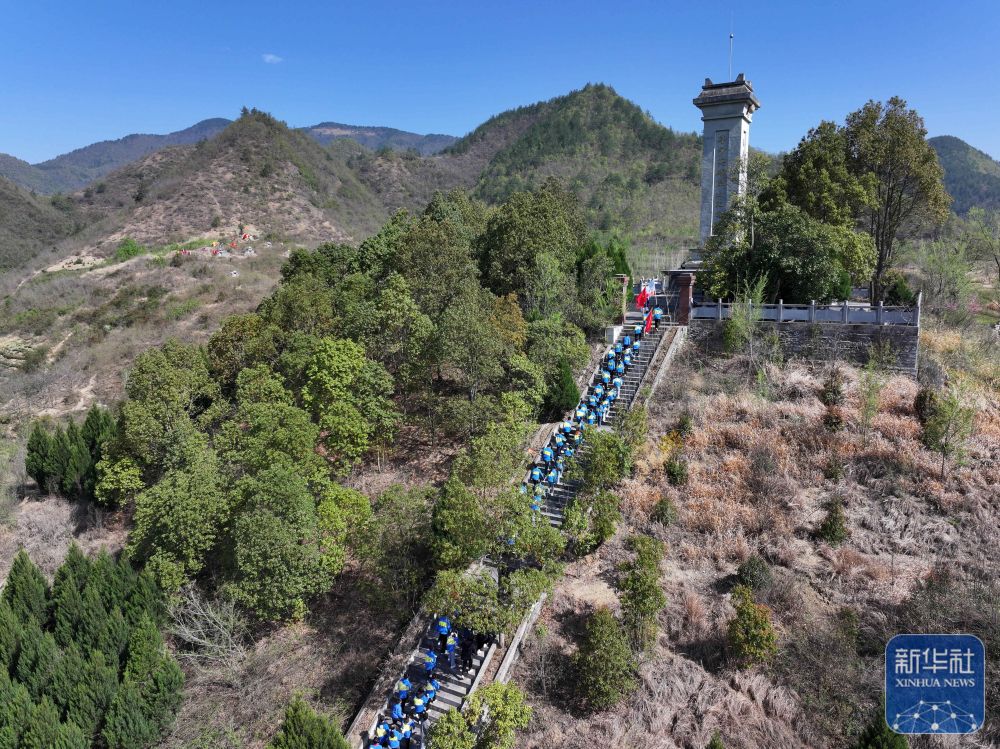 ↑ 3月31日,贵州省遵义市播州区尚嵇中学的师生在茶山关烈士陵园开展祭奠活动(无人机照片)。新华社发(袁福洪摄)