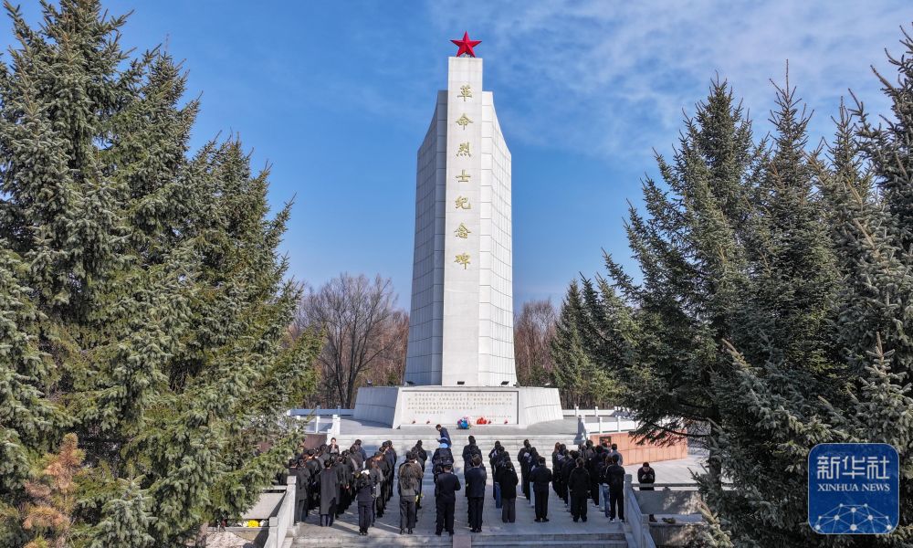 ↑ 4月1日,黑龙江省绥芬河市各界青年代表在革命烈士纪念碑前缅怀革命先烈(无人机照片)。新华社发(曲艺伟摄)
