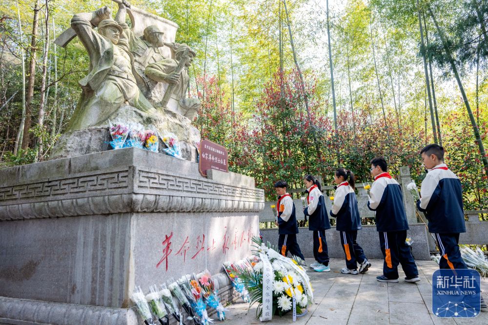 ↑ 4月2日,浙江省湖州市长兴县龙山街道革命烈士陵园,来自该县实验小学的学生在纪念碑前敬献鲜花。新华社发(谭云俸摄)