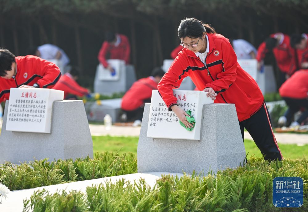 ↑ 4月2日,在位于河北省石家庄市的华北军区烈士陵园,学生为烈士擦拭墓碑。新华社发(张晓峰摄)