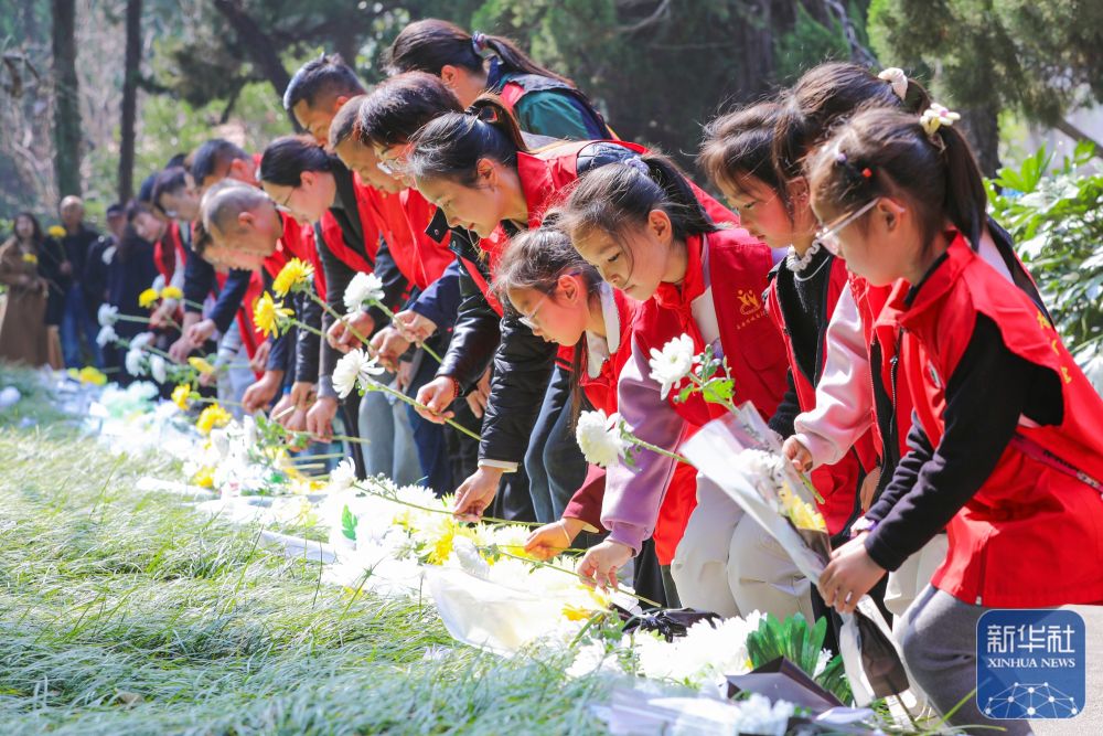 ↑ 4月2日,在江苏省海安市烈士陵园,志愿者向烈士敬献鲜花。新华社发(顾彬斌摄)
