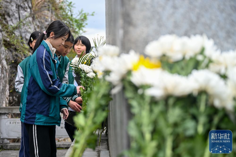 ↑ 3月31日,贵州省遵义市播州区尚嵇中学的学生在茶山关烈士陵园向烈士墓碑献花。新华社发(袁福洪摄)