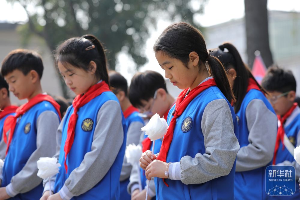 ↑ 4月1日,在湖南省怀化市通道侗族自治县烈士陵园,小学师生为烈士默哀。新华社发(粟勇主摄)